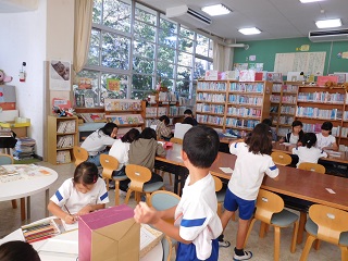 休み時間の図書館では,子どもたちが読書郵便を作っています。