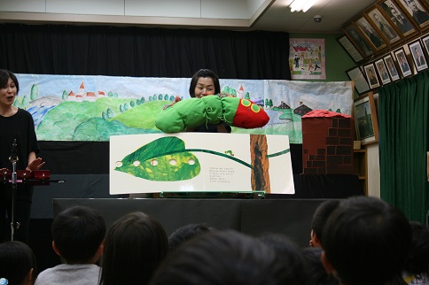 | こーんなに大きく成長したよ! 大きなあおむしくんが登場すると1年生は大喜び♪ やがて,あおむしはさなぎになり,そして・・・。 |